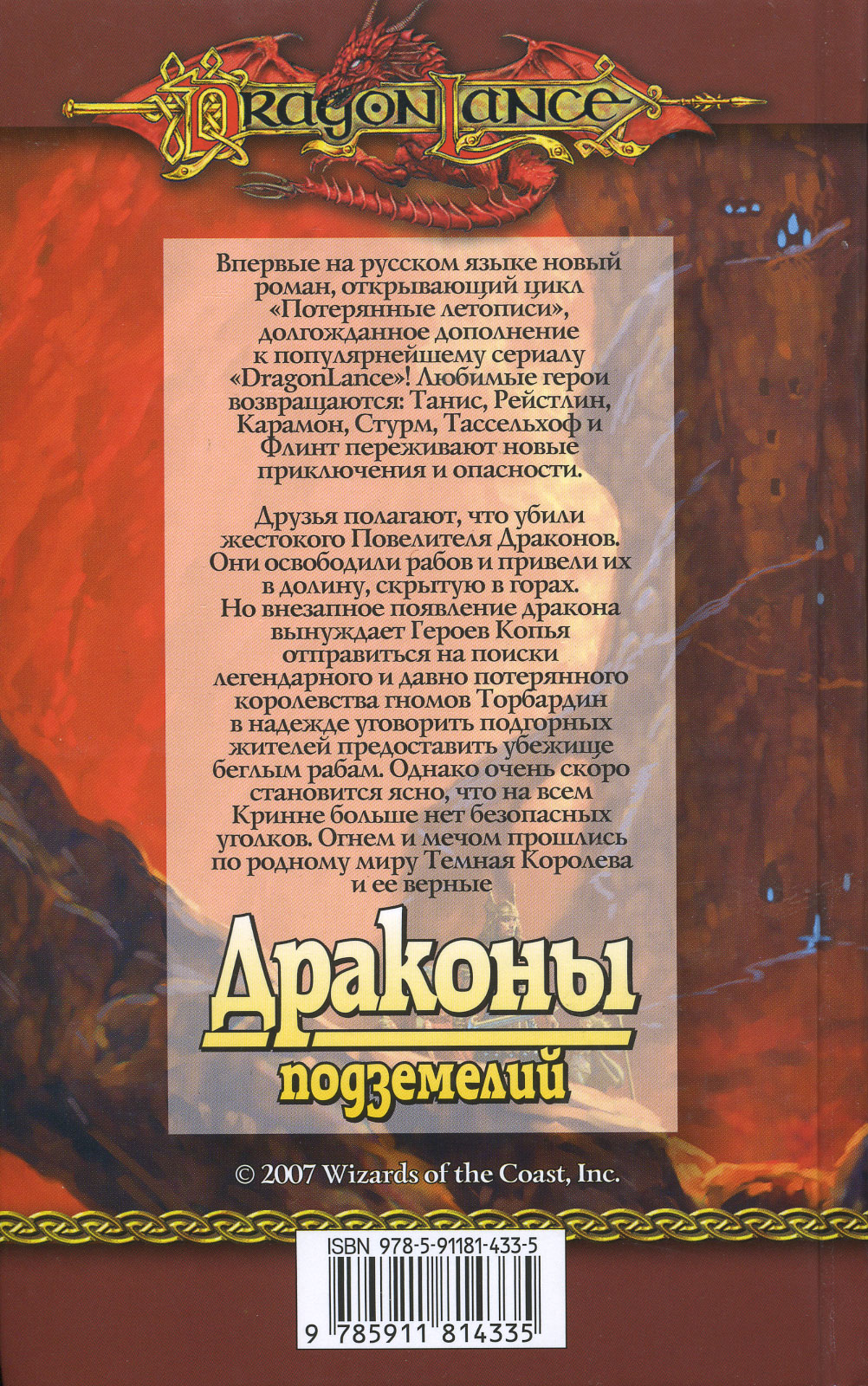 Уэйс Маргарет, Хикмэн Трэйси. Драконы подземелий: Роман / Пер. с англ. Т.Шушлебиной — М.: ИЦ «Максима», 2007. — 480 с. ISBN: 978-5-91181-433-5 Впервые на русском языке новый роман, открывающий цикл "Потерянные летописи", долгожданное дополнение к популярнейшему сериалу "DragonLance"! Маргарет Уэйс и Трэйси Хикмэн представляют одну из нерассказанных историй Войны Копья. Любимые герои возвращаются: Танис, Рейстлин, Карамон, Стурм, Тассельхоф и Флинт переживают новые приключения и опасности. Друзья полагают, что убили жестокого Повелителя Драконов. Они освободили рабов и привели их в долину, скрытую в горах. Но внезапное появление дракона вынуждает Героев Копья отправиться на поиски легендарного и давно потерянного королевства гномов Торбардин в надежде уговорить подгорных жителей предоставить убежище беглым рабам. Однако очень скоро становится ясно, что на всем Кринне больше нет безопасных уголков. Огнем и мечом прошлись по родному миру Темная Королева и ее верные Драконы подземелий! Margaret Weis, Tracy Hickman. Dragons of Dwarven Depth (The Lost Chronicles, Volume One). (c) 2006 Wizards of the Coast Inc.